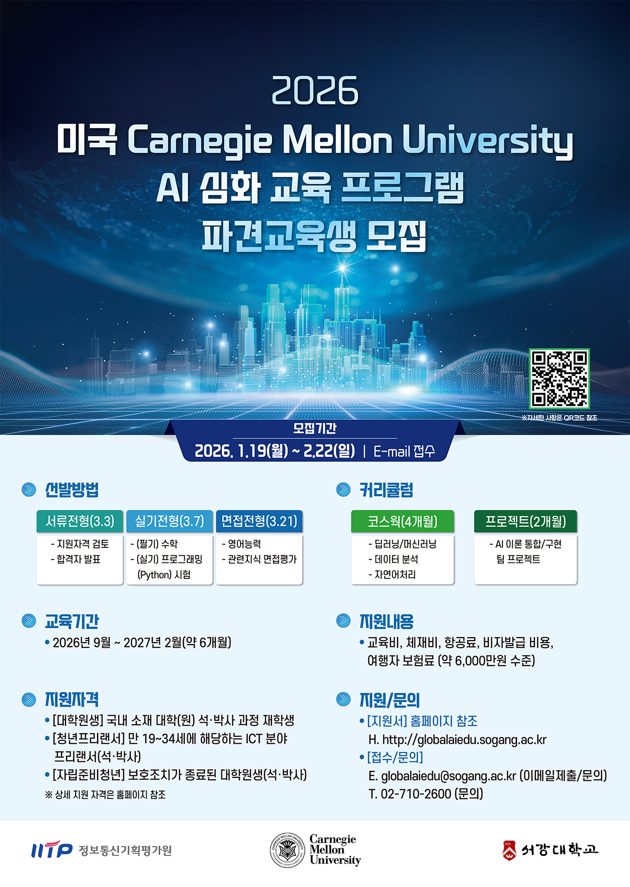 | [서강대학교] 2026 Carnegie Mellon University AI 심화 교육프로그램 파견 교육생 모집 | ||