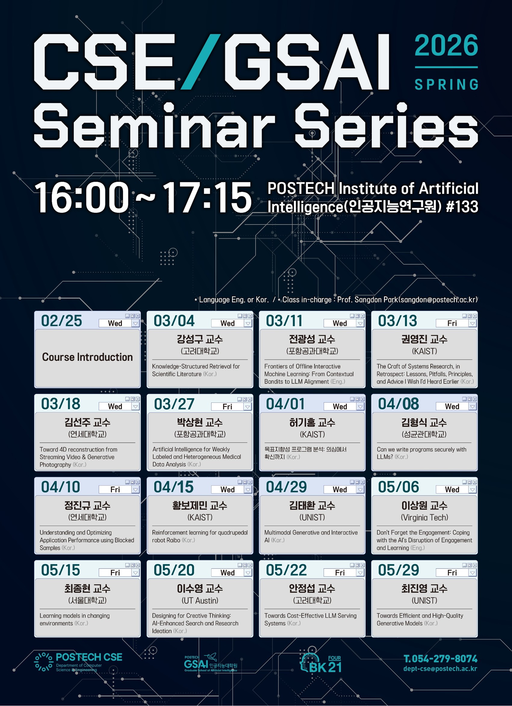 2026-1학기 SPRING CSE/GSAI Seminar Series 안내드립니다.