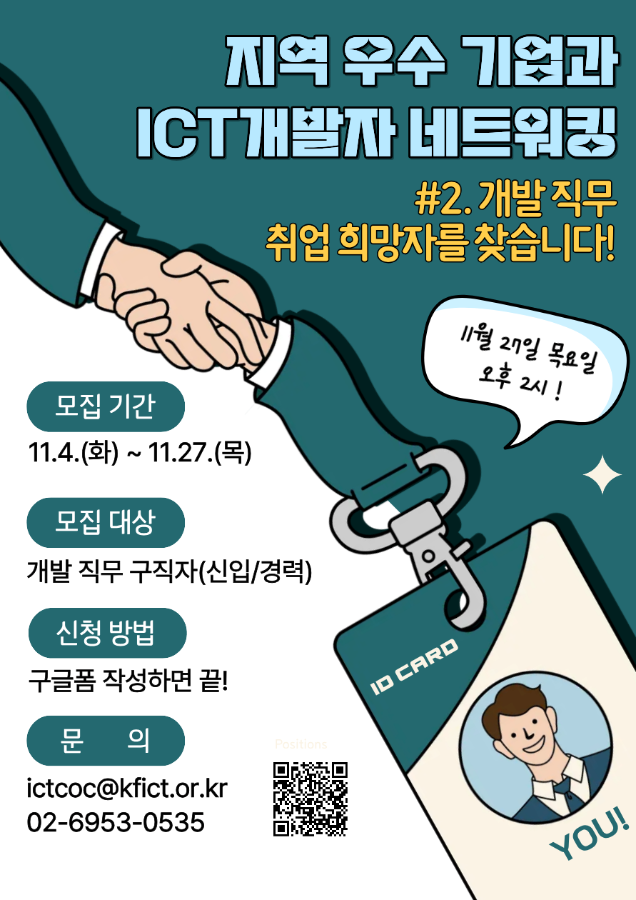 | 「지역 우수 기업 × ICT개발자 네트워킹」 우수 기업과 이야기 나눌 구직 희망자 여기로!!!(~11.27.(목)) | ||