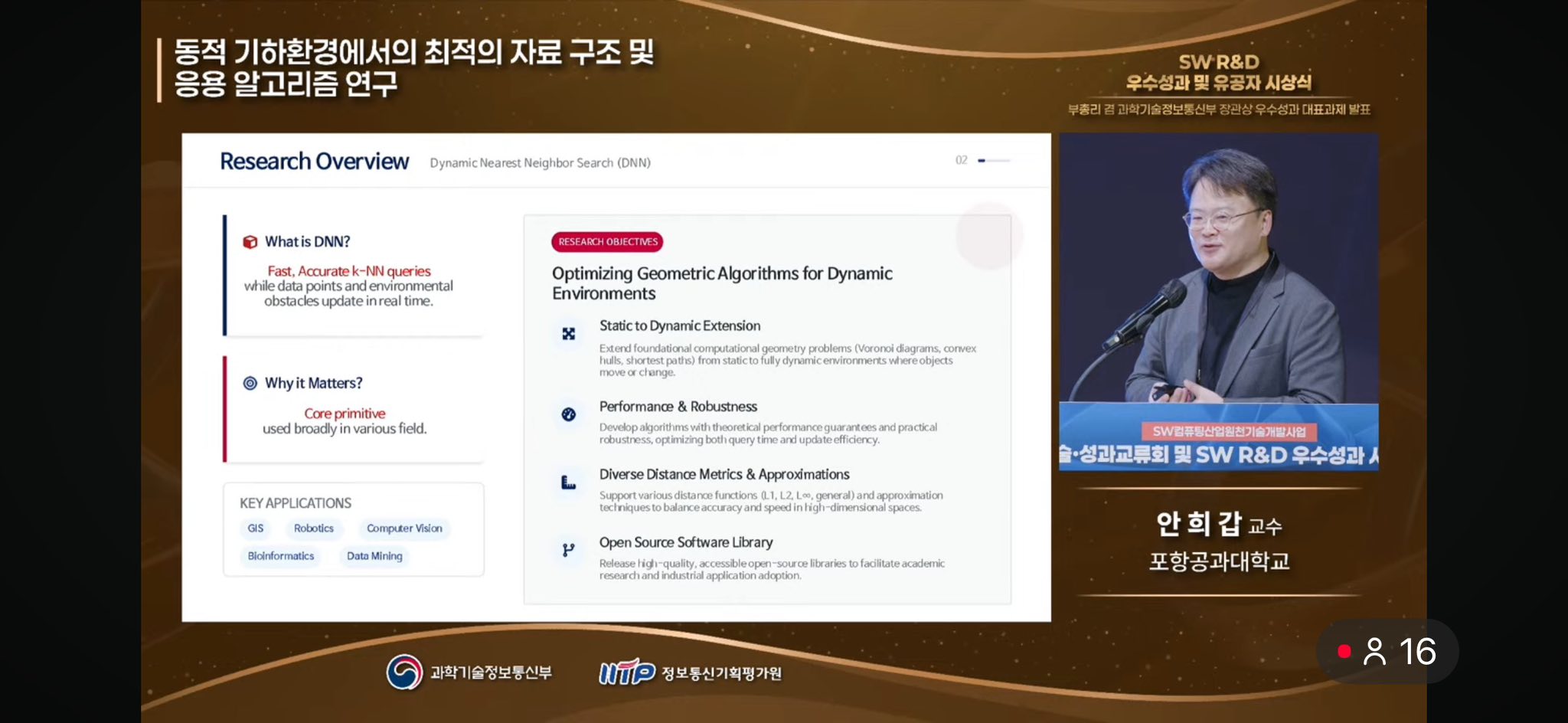 안희갑 교수님과 연구팀은 지난 8년간 동적 최근접 이웃 탐색(Dynamic Nearest Neighbor Search) 기술을 고도화하여, GIS, 로보틱스, 컴퓨터 비전 등 다양한 분야의 핵심 기반 알고리즘을 정적 환경에서 완전 동적 환경으로 확장하는 성과를 냈습니다. 또한 고차원·복잡 환경에서도 높은 성능을 보이는 Exact/Heuristic/Approximation Algorithms을 통합적으로 개발하고, SODA·SoCG·AAAI 등 최상위 국제학회 발표, 14건의 특허, 고품질 오픈소스 SW 공개 등을 통해 연구적·산업적 파급력을 입증하였습니다.