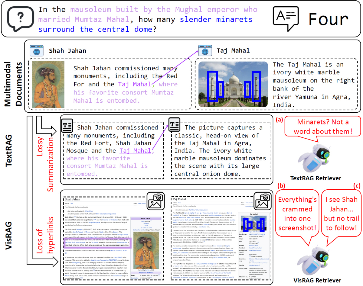 멀티모달 문서(웹페이지·PDF 등)에서 문단·표·이미지처럼 서로 연결된 구성요소를 찾아주는 검색기는, (1) 고정된 단일 단위로만 검색해 불필요한 내용이 섞이는 ‘그라뉼러리티(단위) 문제’와 (2) 하이퍼링크·동일 페이지 등 구성요소 사이의 구조적 연결을 살리지 못해 ‘멀티홉 추론 문제’가 동시에 발생한다. 텍스트 요약 기반(TextRAG) 접근은 시각 정보를 텍스트로 바꾸는 과정에서 핵심 단서가 누락되기 쉽고, 스크린샷 기반(VisRAG) 접근은 보통 ‘페이지 전체’처럼 거친 단위로 임베딩해 질의와 무관한 부분이 많이 섞이며 구성요소 간 링크를 잃어버린다. 이로 인해 정밀 검색과 다단계 추론이 모두 제한된다.
