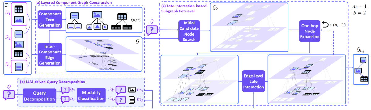 (2) ‘지연 상호작용(late interaction)’ 기반 서브그래프 검색: 온라인 단계에서 질의를 하위 질의로 분해하고(모달리티 분류 포함), 상층 노드에서 후보를 찾은 뒤 빔 서치로 연결 엣지를 따라 확장한다. 각 엣지 점수는 엣지 양 끝의 ‘미세 하위 구성요소(문장·표-행·객체)’와 하위 질의 간 최대 유사도를 합산해 동적으로 계산한다(엣지 임베딩을 전수 계산하지 않아도 됨). 고립 노드·편측 매칭 같은 특수 경우도 처리한다.
