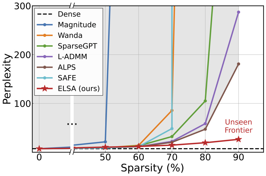 본 연구는 기존 거대언어모델 희박화 연구에서 도달하지 못했던 고희박도 (90%) 영역 달성을 위해 원목적함수의 중요성을 규명하고 이를 통해 실제로 도달할 수 있음을 시연하였다. 이를 위해 제약 최적화 기반의 원목적 함수 기반 희박화 기법을 설계하고 원목적함수에 더욱 적합한 설계로 고도화 및 수렴성 등 이론적으로 분석하였다. 다양한 거대 언어모델 종류 및 크기에서 기존 방법보다 매우 뛰어난 고희박도 성능을 확보할 수 있음을 보였고, 특히 가장 많이 사용되는 LLaMA-2-7B 모델의 90%희박도에서 기존 기법 대비 x7.8배 낮은 perplexity를 기록하였다. 이러한 성능에서 원래의 모델 대비 x2.5배의 추론 속도 향상 및 x4.6배의 메모리 압축률이 가능함을 보였고, 이는 대규모 언어 모델이 많이 활용되는 상황에서, 희박화를 통해 구동 비용을 획기적으로 줄일 수 있는 효과적이고 이론적인 새로운 방안을 제시하였다는 점에서 학술적·실용적 의의가 크다.
