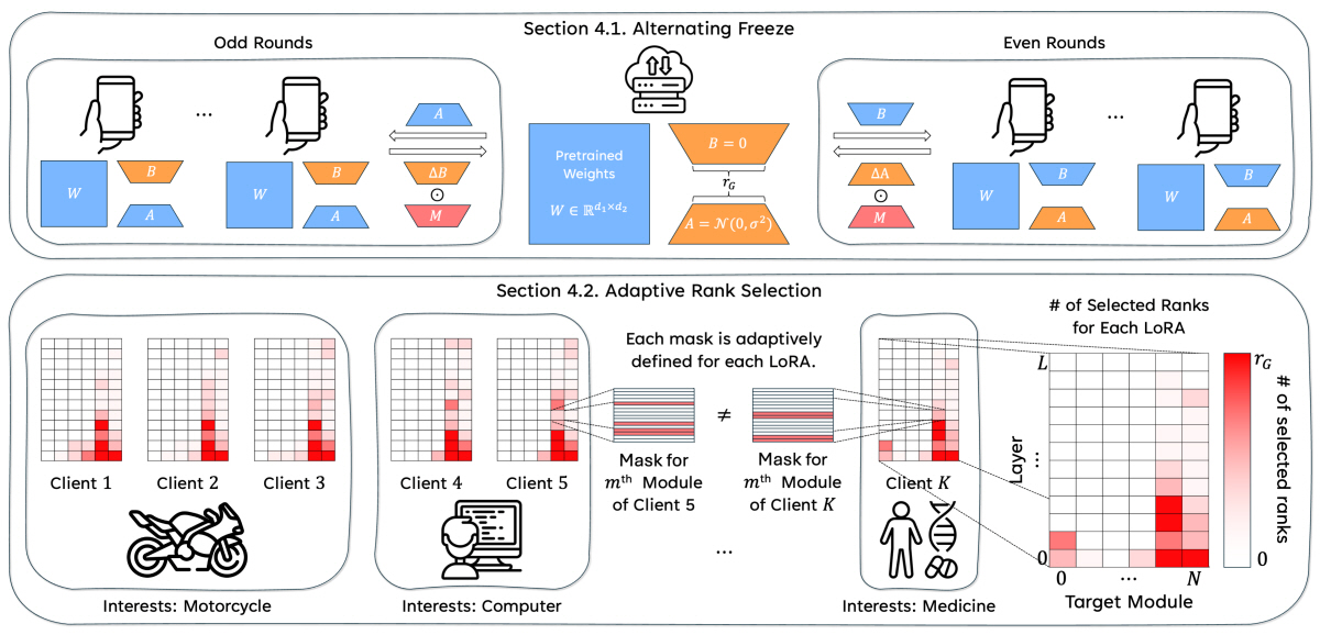 본 연구는 Alternating Freeze와 Adaptive Rank Selection이라는 두 가지 핵심 기술을 도입하여, 모델의 파라미터 탐색 공간을 효율적으로 활용함으로써 성능 저하 문제를 해결하였다.